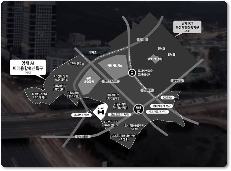 강남업무지구와의 직주근접에 양재IC, 강남순환대로의 교통편의성, 양채천, 서초문화예술공원등의 힐링공간에, 이마트양재점, 코스트코등의 생활편의와 양재학군으로 입지적 장점이 있습니다.