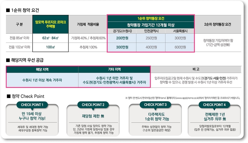 수원에 대표 기업체인 삼성, 대형마트, 수인분당선 광역버스, 용인서울고속도로, 수원신갈ic등 교통, 생활인프라, 영통학원가등 생활인프라가 좋아 젊은 층이 선호하는 지역이나 구축아파트 단지들만 있는 아쉬움 속에 망포역세권에 40층 주상복합 아파트인 '망포역 푸르지오 르마크'가 8월29일 모델하우스(견본주택)를 오픈 예정입니다.