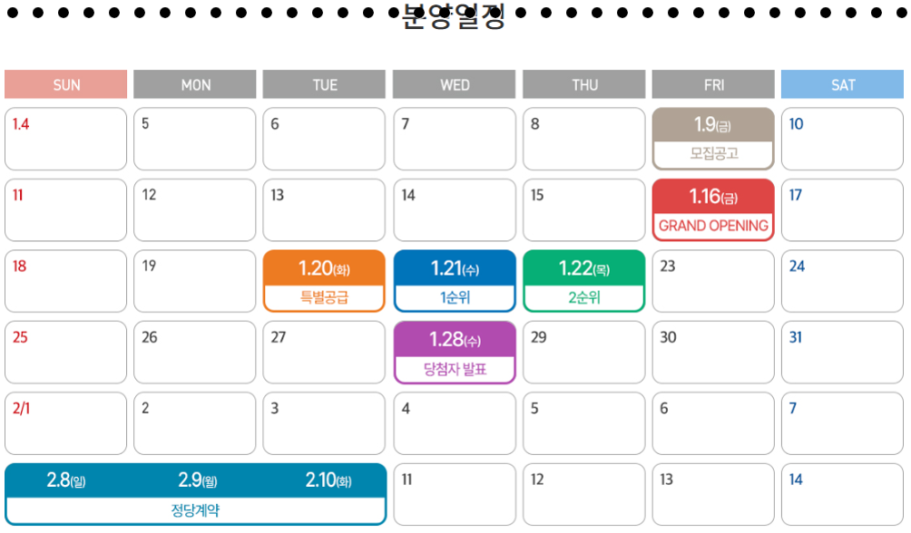 1월9일 모집공고, 1월16일 모델하우스(견본주택) 오픈 이후 1월20일 특별공급, 1월21일 1순위 1월22일 2순위 청약일정입니다.