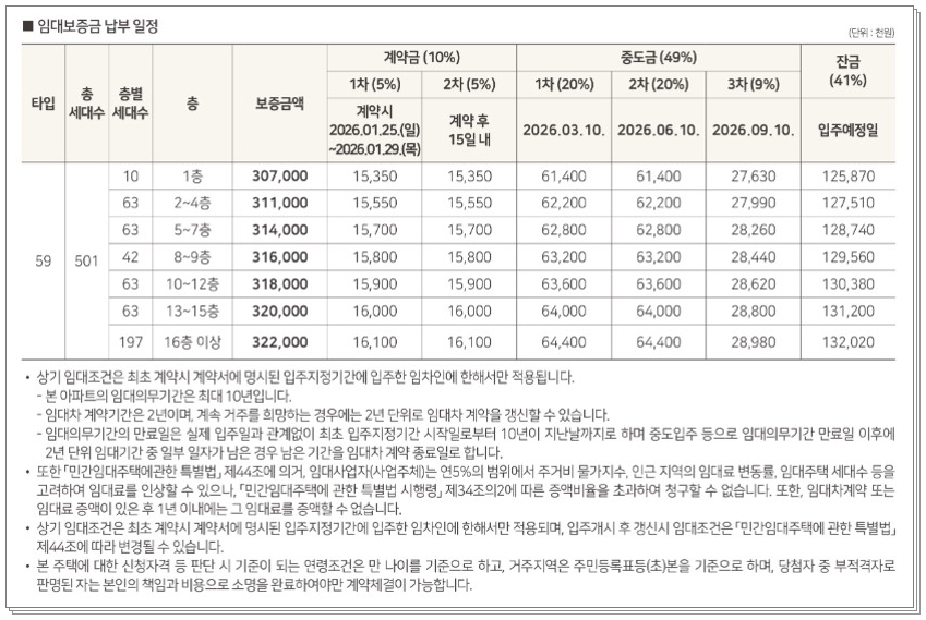 전용면적 59㎡ 단일면적으로 임대보증금은 307,000,000 ~ 322,000,000원 입니다.