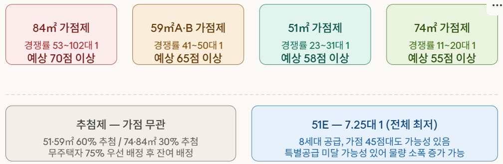 74A(14.14대 1), 74B(14.75대 1), 74C(11.91대 1)는 전체 평균(31.9대 1)의 절반 수준입니다. 분양가 부담(16억 8천)으로 진입 장벽이 높았지만, 역으로 보면 84㎡에 비해 상대적으로 낮은 경쟁률에서 당첨된 세대는 우수한 입주 여건을 갖추게 됩니다.